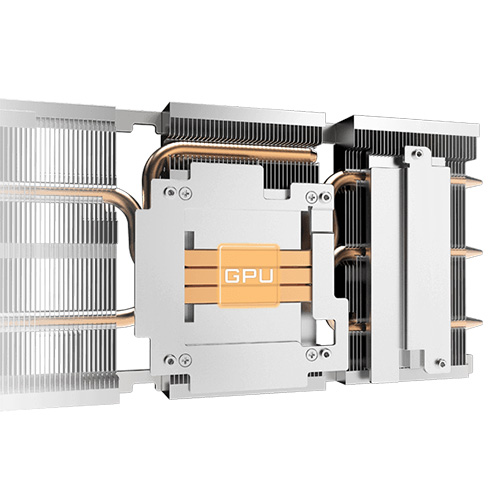 The shape of the pure copper heat pipe maximizes the direct contact area with the GPU, enhancing heat transfer. The heat pipe also covers the VRAM through a large metal plate contact to ensure proper cooling.