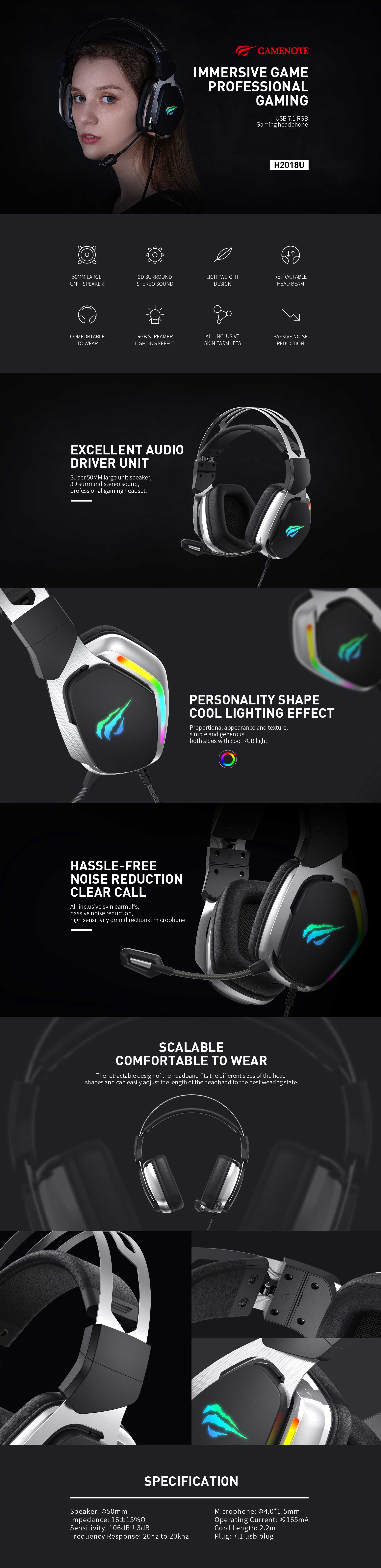 Havit HV-H2018U USB 7.1 RGB Gaming HeadphoneHavit HV-H2018U RGB Gaming Headphone comes with super 50MM large unit speaker, 3D surround stereo sound, Proportional appearance and texture, simple and generous. In this gaming headphone, Hassle-free noise reduction, personality shape cool lighting effect, Proportional appearance and texture, simple and generous,both sides with cool RGB light. Here, the retractable design of the headband fits the different sizes of the head shapes. This Havit Headphone is featured with Flexible and convenient 90°rotating earmuffs, which can comfortably hang the headphones around the neck, Impedance: 32 ±10%Ω, Sensitivity: 118dB±3dB, Frequency Response: 20hz to 20k hz, Microphone: Φ4.0*2.7mm, Operating Current: ≤ 20mA, Cord Length: 2.2m, Plug: 7.1 usb plug. features:Super 50MM large unit speaker, 3D surround stereo soundProportional appearance and texture,simple and generous,both sides with cool RGB light.The retractable design of the headband fits the different sizes of the head shapesFlexible and convenient 90°rotating earmuffs, which can comfortably hang the headphones around the neck .. |